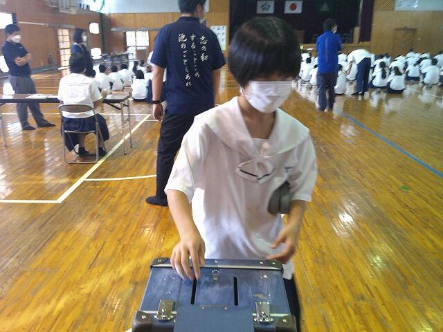 10月7日、生徒会選挙と立会演説会が行われました。候補者たちは、今よりも更に良い志和池中にするために、自分が考えている熱い思いを、一生懸命に話してくれました。特に候補者たちからよく出た言葉が「志和池ブランドの更なる進化」でした。”挨拶、立腰、反応”を良くするために、”生徒会役員になり、こんなことを提案し、実行したい”候補者たち一人ひとりの思いを生徒のみんなも真剣な眼差しで聞いていました。新しい生徒会も、きっと素晴らしい志和池中を創りあげてくれるでしょう。
