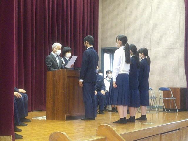 10月31日(月)生徒会役員の退任式と認証式がありました。旧役員と新役員がステージ上で紹介され、旧生徒会長から最後の話が、そして新生徒会長からは最初の話が生徒全員に語られました。旧生徒会長から全校生徒へ「僕たちは、みなさんの期待に応えることができたでしょうか?」という言葉に、生徒たちは「ありがとう」の言葉のかわりに体育館全体に響き渡る大きな拍手で答えてくれました。新生徒会長も「旧生徒会役員のみなさんが創りあげてきた”志和池ブランド”を更に素晴らしいものにしていきます」と思いをつなぐことを決意表明してくれました。