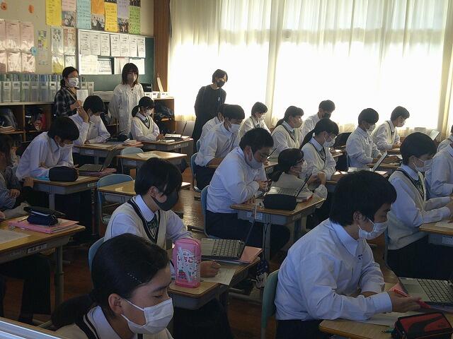 11月4日、本校で、今年3回目の参観日が行われました。1、2年生は参観授業、3年生は県立高校入試説明会という内容でした。教室の中では、先生方がICT機器を活用した授業が展開され、体育館で行われた説明会は、生徒・保護者ともに真剣な表情で今後の入試の日程や、推薦入試の要項を聞く姿がみられました。