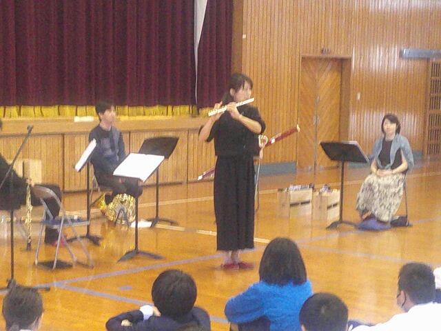 6月1日(木)本校では、鑑賞教室が開催され、今年は木管五重奏の音楽グループ”クインテッドアッシュ”のみなさんに来校していただきました。最初にフルート、クラリネットなど楽器の紹介をしてもらい、次に”カルメン””ドラえもん”などの楽曲を演奏をしていただきました。生徒たちは、初めて聞く本格的な音楽に時間を忘れて聞き入っていました。放課後は本校の吹奏楽部の部員が直接指導を受け、大変貴重な経験をすることができました。また、機会があれば是非素晴らしい演奏を聞きたいです。