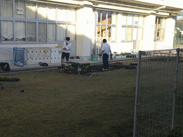 12月13日の放課後、環境美化委員会の生徒のみなさんで、学級園にパンジーを植えました。今年は、例年植えているビオラが少なかったので、パンジーのみで、それぞれのクラスの花壇に工夫を凝らして、花をレイアウトしました。硬くなっていた土を鍬で耕し、柔らかくなった土にそっと花をおき、土をかぶせる作業を繰り返しおこないました。昨日まで雑草だらけの花壇が、今日から赤や黄色、色とりどりのパンジーで、私たちを楽しませてくれます。花が枯れないように、これからも水やりを忘れず、雑草を抜くなど、花壇の手入れを頑張って欲しいです。