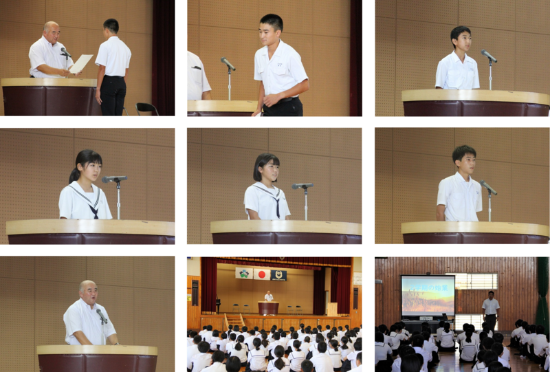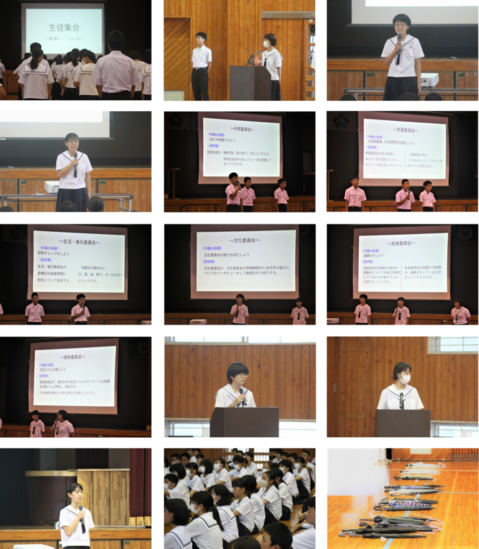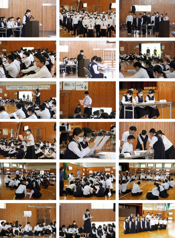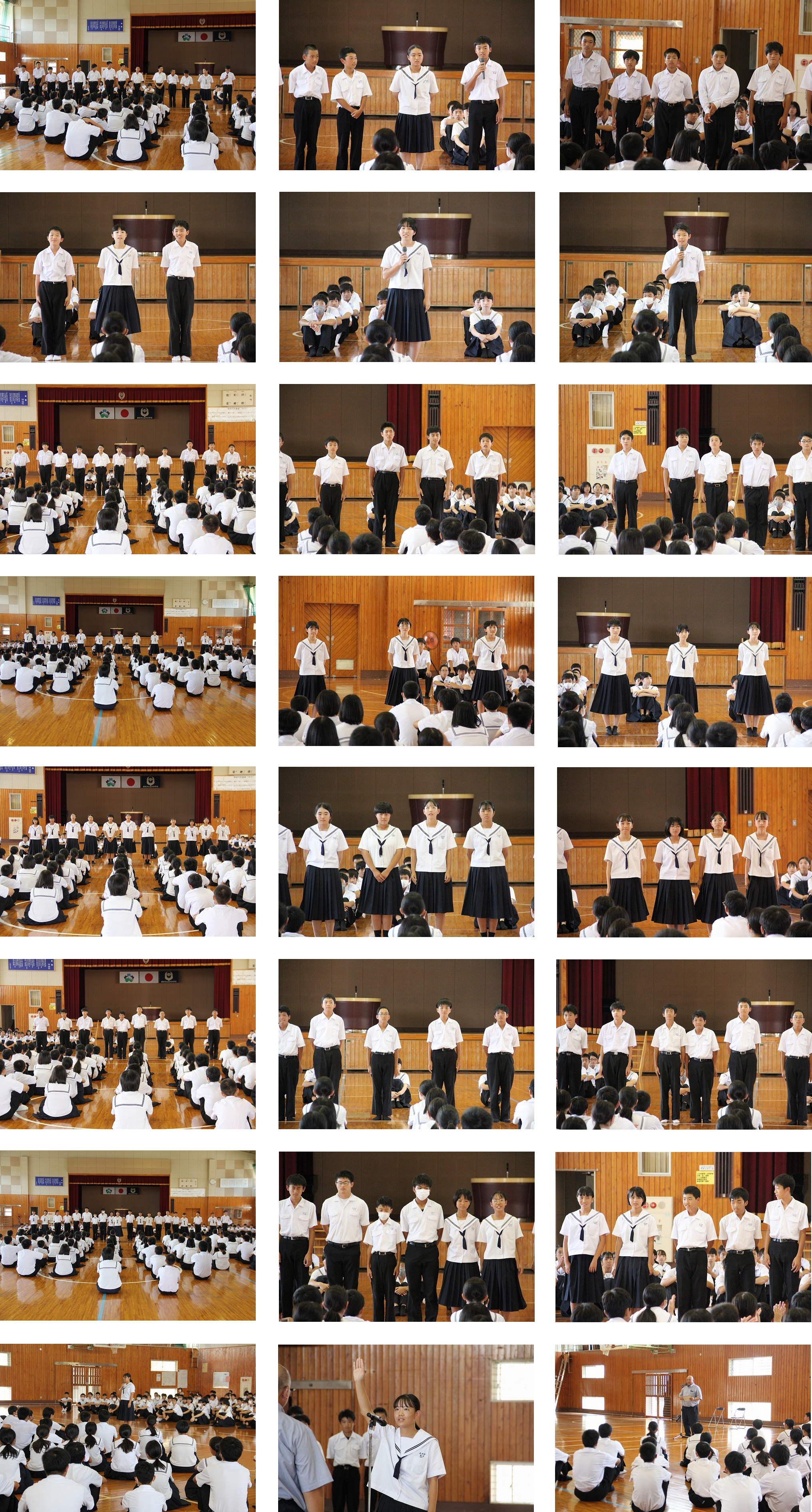 本校が出場するのは、水泳、男子バレーボール、柔道、バドミントン、剣道、男子ソフトテニス、女子ソフトテニス、女子バスケットボール、軟式野球、陸上競技の10競技です。生徒、職員、保護者、地域のみなさんが応援しています。全力を出し切り、悔いの残らない試合をしてきてください。健闘を祈ります。