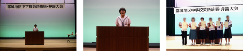 プログラム2番は、英語暗唱の発表が行われました。タイトルは「I hate manju」。都城地区英語暗唱・弁論大会で最優秀賞を受賞した時任紗楓さんが、身振り手振りを交えて表情豊かに発表してくれました。