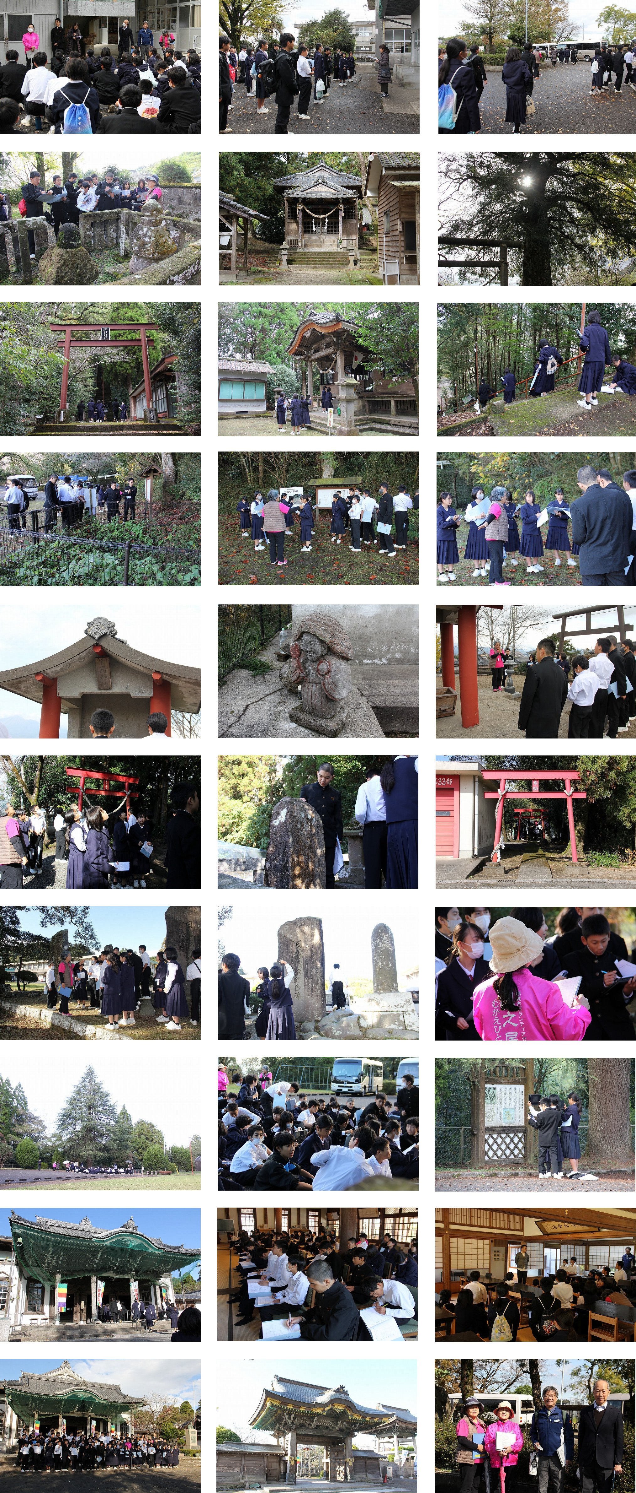 11月17日(金)、1学年が地域巡見を行いました。この取組は、庄内地区まちづくり協議会教育文化活動部会が主催し、ガイドボランテティアの皆さんの協力を得て毎年行われています。当日は、雨も心配されましたが、無事に終えることができました。4台のバスに分乗し、平田かくれ念仏洞跡、乙房神社田の神様、宮島中央権現、諏訪神社、山久院跡、三島通庸遺徳の碑、安永城跡、願心寺を巡りました。歴史的な史跡だけでなく、現在は使うことができなくなった関之尾甌穴群の石が使われた石積みなどの説明を受け、庄内地区の歴史を見て、聞いて、感じ取ることができました。