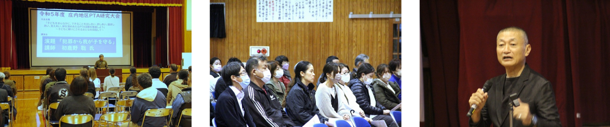 11月22日(水)の夜は、庄内地区PTA研究大会講演会が4年ぶりに行われました。会場となった乙房小学校の体育館には小中のPTA会員が集まり、『犯罪から我が子を守る』と題して初鹿野 聡 氏(NPOみんなのくらしターミナル代表)にご講演いただきました。地域に暮らす大人として、まず自分にできる行動を起こすことが大切で、犯罪から守ることは、犯罪被害者とならないように守ることだけではなく、犯罪加害者にならないように守ることも含まれるなど、大切な視点を示していただきました。