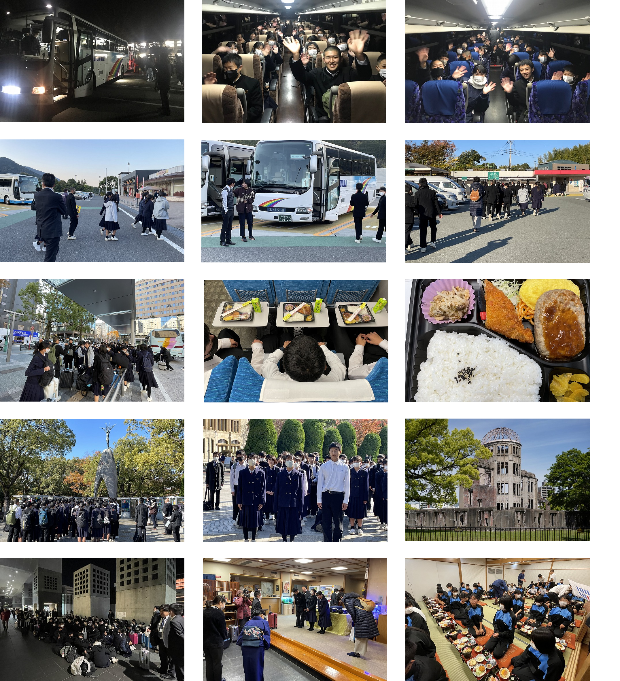 11月26日(日)早朝5時半、体育館に集合した2年生は出発式を終えてバスに乗り込み、多くの保護者に見送られながら修学旅行に出発しました。バスに乗り込んだ2年生は、待ちに待った修学旅行とあって、早朝にもかかわらず元気いっぱいでした。九州道を北上し、宮原SAと広川SAでトイレ休憩を取り、博多駅からは新幹線に乗り換えてお弁当を食べながら広島へ向かいました。