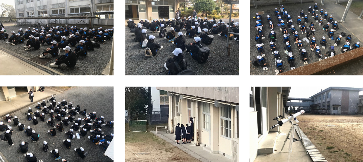 1年生の出発式の様子を2階から撮影していると、理科室の外に3年生の女子生徒が集まっています。「何だろう?」と理科室前に向かってみると天体望遠鏡を使って太陽の観察をしていました。修学旅行と同様、百聞は一見にしかず。あいにく雲が目立っていてじっくりと観察することはできなかったようですが、全員観察することができました。