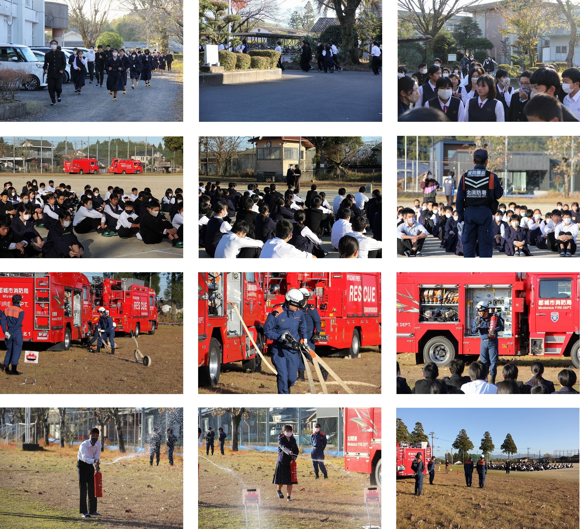 12月7日(木)6校時、避難訓練を実施しました。今回は、都城市消防局北消防署の皆さんにご協力いただき、訓練を観察して評価をしていただきました。訓練の内容は、授業中に火災を発見した先生が大声で知らせると共に火災報知器で発報、消防への通報と同時に初期消火に当たったが失敗し、全校生徒をグラウンドに避難誘導するという設定でした。
