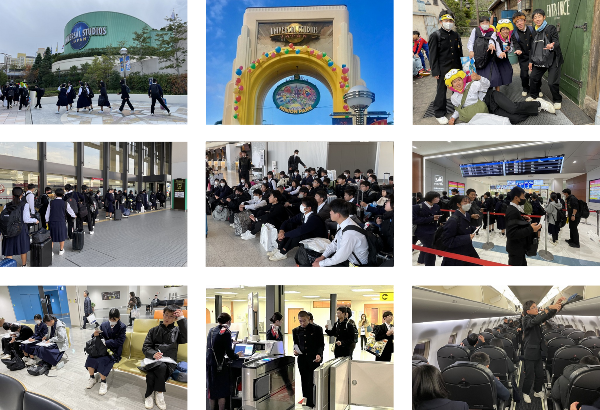 11月28日(火)、修学旅行の最終日はUSJ(ユニバーサル・スタジオ・ジャパン)を楽しみました。入園前に集合写真を撮り、集合時間の確認をして、いよいよ入園。生徒たちは一目散にアトラクションに向かいました。キャラクターの帽子をかぶり、園内での雰囲気を精一杯楽しむ生徒やお目当てのアトラクションに並ぶ生徒、園内でしか食べられないファーストフードやスイーツを楽しむ生徒、パレードやステージを楽しむ生徒とそれぞれでした。滞在時間が少なくなってくると、時間をかけて家族へのお土産を選ぶ生徒や記念写真を撮る生徒が増えていました。
