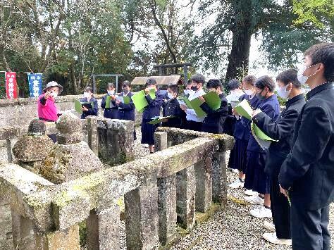 1年生は11月19日(金)に、庄内地区に残されている歴史的建造物や史跡を見学して回りました。都城島津邸の館長さんや庄内の昔を語る会、関之尾むかえびとの会の方々にガイドをしていただきながら平田かくれ念仏洞跡や乙房神社田の神様、宮島の中央権現、諏訪神社、山久院跡、三島通庸遺徳の碑、安永城跡、願心寺本堂・書院を見学しました。庄内地区の歴史に触れ、改めて郷土に対する愛着が深くなったのではないかと思います。