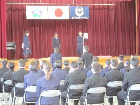 1月7日(金)は、3学期の始業式を行いました。1年生代表・2年生代表は学級委員長としてクラスをまとめ、学習や部活動に力を入れていきたい。3年生代表は、高校受験ということにだけ集中し努力をする。生徒会代表は各委員会の活動を意識的に活動できるように計画を見直し、準備を進める。また、公約を果たしたいと述べてくれました。そして、校長先生は、3学期は1年を仕上げる大切な学期であるとともに、次年度の準備期間であることを話されました。それぞれの生徒が飛躍できる年になることを応援していきたいと思います。