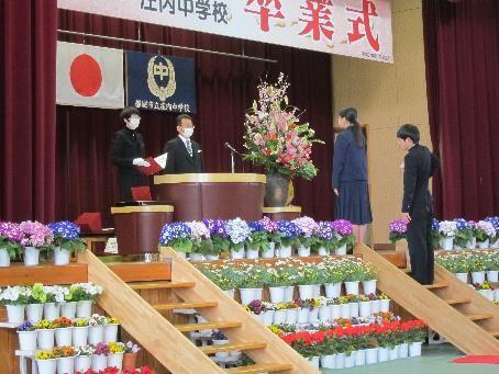 晴天に恵まれ桜も蕾をたくさんつけて開花を待っている中、3月16日(木)、庄内中学校第76回卒業式を開催しました。卒業生72名は、学級担任の先導のもと、凛々しい姿で入場し、式が始まりました。在校生送辞、卒業生答辞、卒業式の歌と続く中で、皆感極まり涙を誘いました。会場全体が感動で幸せな気持ちに包まれました。卒業生の皆さん、ご卒業おめでとうございます。これからも自分の力を信じ、ご活躍してください。
