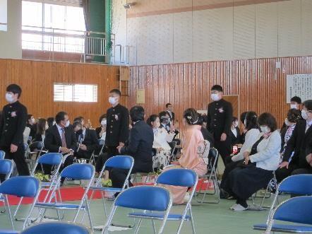 花いっぱいに飾られた体育館で行われた入学式。吹奏楽部の演奏が響く中、担任の先生に先導されて赤絨毯を新入生が入場しました。