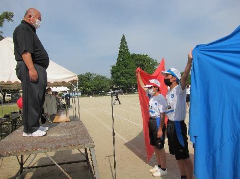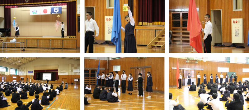 対面式の後は、引き続き結団式が行われました。昨年度から5月開催となった体育大会。ゲームやじゃんけんを交えながら団編成が行われ、メインイベントの団色決定。両団の団長がステージに上がり、選んだくす玉を同時に引くと、紙吹雪とともに団色が現れました。団旗の授与を受け、赤、青の両団に分かれて応援リーダーの自己紹介やシュプレヒコールをあげていました。
