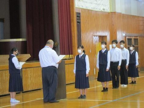 6月1日(水)は、地区中学校総合体育大会に出場する選手の壮行会を行いました。水泳競技は5月31日(火)に大会が行われ、3名が県大会に出場します。続いて4日、5日は陸上・バドミントン競技が、また、その他の競技は11日、12日、13日に行われます。どの選手も気合が入り、自信にあふれ、多くの選手が県大会に出場してくれることを期待させてくれました。