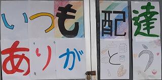1月は給食を運搬してくださる方への感謝を表すため、画用紙に言葉やイラストを描いてコンテナ室の搬入口に掲示ました。2月には給食センターの方々への感謝の手紙を書く予定にしています。