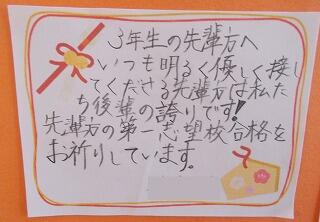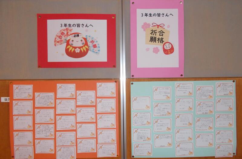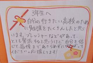 3年生は自分の進路を決める各高校の入試に向けて勝負の時を迎えています。そのような中、頑張っている3年生に2年生からの温かい応援メッセージが届けられています。これまでお世話になった先輩たちへの感謝とエールが込められた内容となっています。