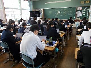 今月16・17日は学年末テストがあります。このテストに向けて、生徒会の学習委員会の取組として、1、2年生では昼休みにQubenaを用いた自主学習が行われています。
