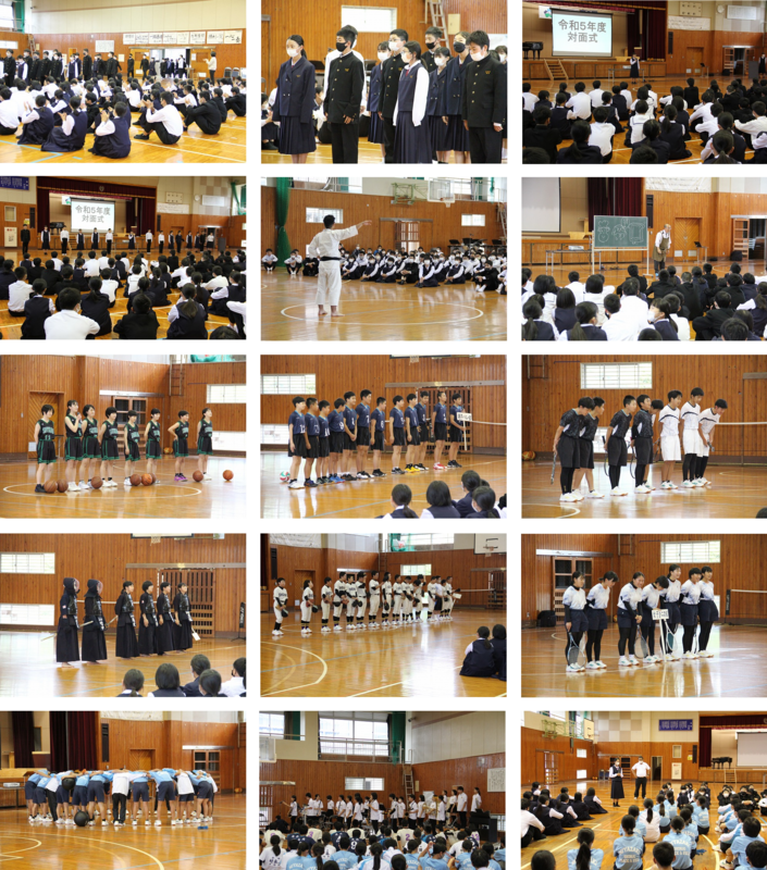 4月14日(金)、4・5校時を使って対面式が行われました。体育館に真ん中を空けて並ぶ2、3年生の間を1年生が入場すると歓迎の拍手が大きく響きました。