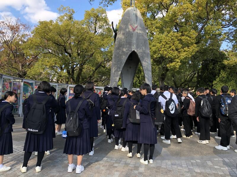 全員元気で病人も出ず、楽しみで新幹線に乗り広島駅まで移動いたしました。広島駅からは全員初めての市電に乗車して、原爆ドームまで移動して平和集会を行い全員合唱で「愛の川を手話付きで歌い上げ、周りの観光客を感動の渦に巻き込みました。また平和講演を受け、原爆と戦争の悲惨さを身に染みて勉強してきました。終了後はまた移動して、新幹線んで京都駅まで移動して、ホテルまで歩いていきました。夕食も全員楽しく美味しくいただき、本日の日課を無事終えることが出来ました。明日は京都市内、自由研修の日です。元気に明日も研修を行います。