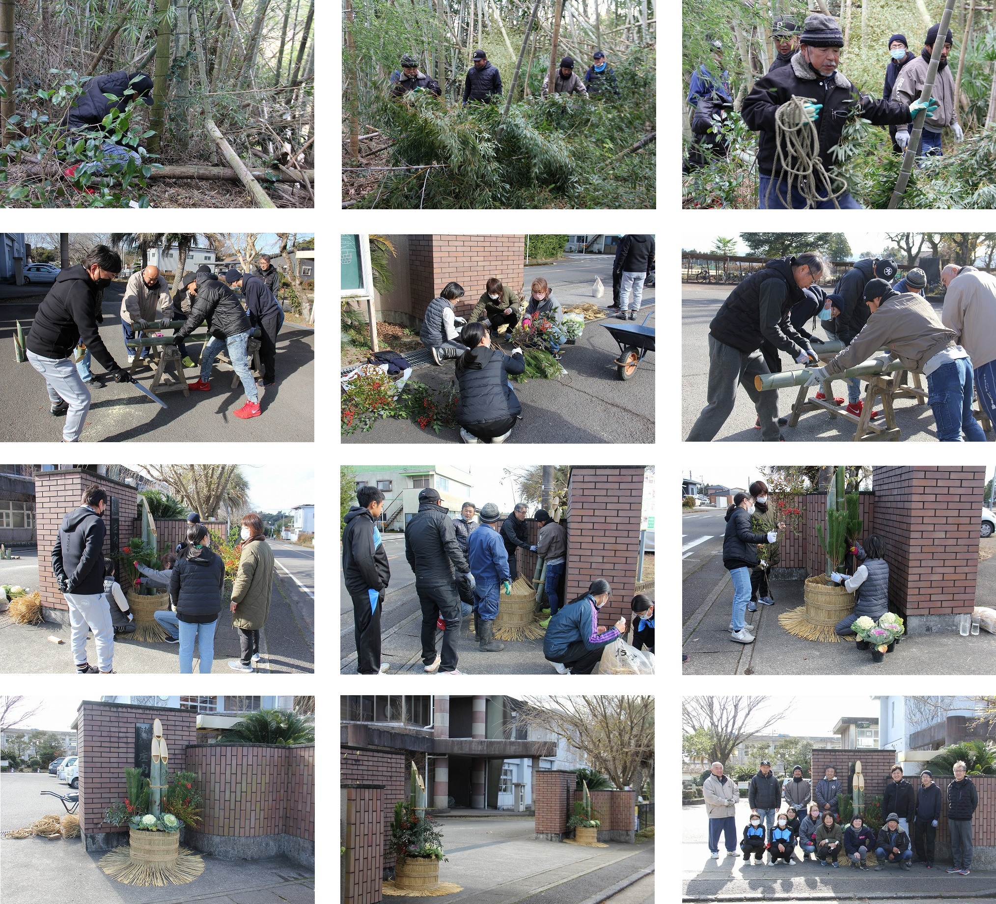 生徒は土嚢の準備。お父さん方は竹を切って土台づくり。お母さん方は飾り付けを担当していただきました。1時間ほどで、今年もドラム缶サイズの門松が見事に完成しました。終業式を1週間後に控えて、正月準備が一つ終わりました。
