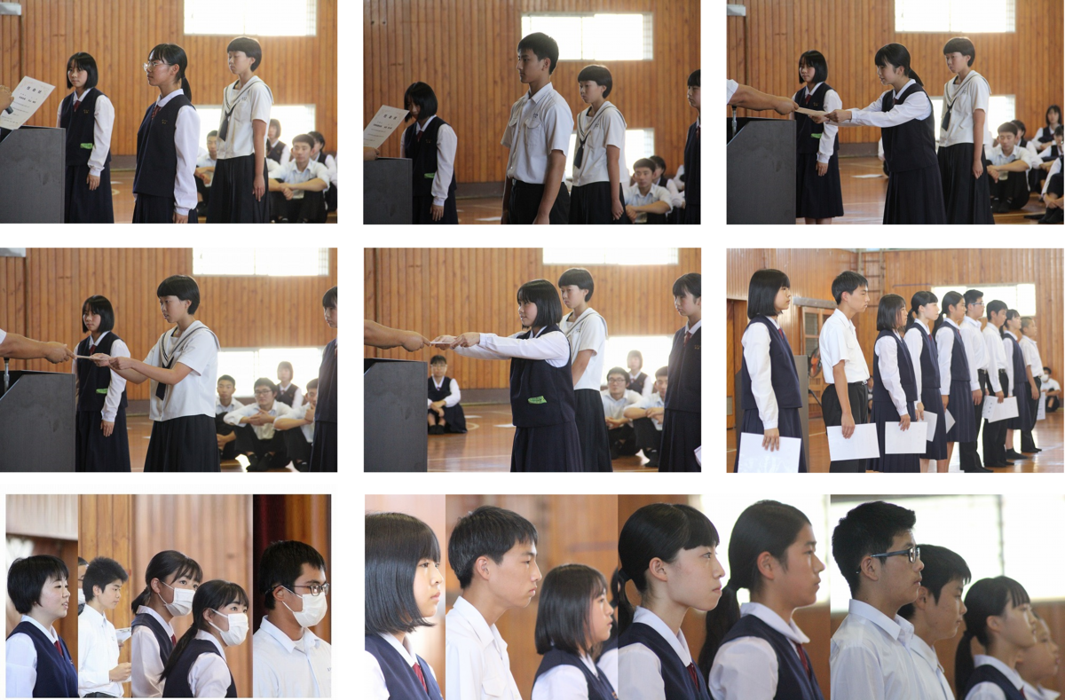 引き続いて任命式を行いました。生徒会選挙で当選した1、2年生で互選した執行部と別途に編制された専門委員会の役員に一人一人校長先生から任命状が手渡されました。メンバーには現生徒会役員として経験を積んで再任された生徒も多くいます。その表情は、堂々としていました。また、初めて役員に選ばれた生徒の表情は緊張して強ばっていました。表情はそれぞれでしたが、これからの1年でメンバー全員がどんどん成長していくことでしょう。