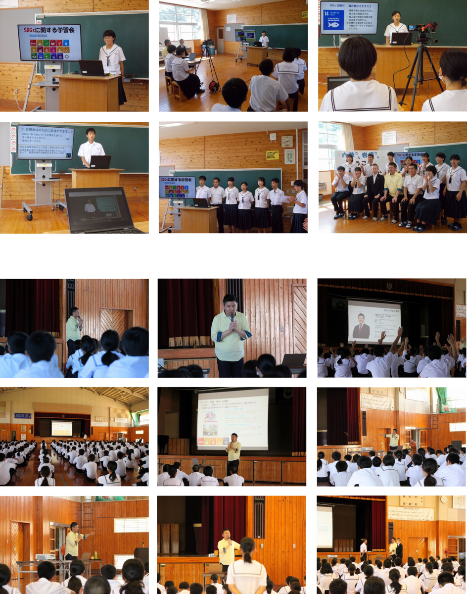 6月22日(木)の総合的な学習の時間に、SDGsに関する発表会及び講話がありました。まず3年生の代表者6名が、SDGsの17の目標の中から自分が興味がある目標1つを選び、その内容や課題、解決のために自分たちにできること等をタブレットを使ってプレゼンテーションにまとめ、オンラインで全校に向けて発表しました。