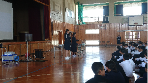 当日は、吹奏楽部による生演奏、出場選手の意気込み等の発表があり、その後、代表激励のことば、全校生徒からの応援エールが送られました。