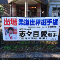 この度、地元後援会により作成された応援横断幕の一つ(左下写真)が本校の正門近くに設置されました。志々目選手のご活躍を全校生徒でお祈りして、故郷庄内からエールを送ります。