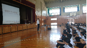 午前中の集会指導では全校集会の際の入退場や整列等の仕方などを、給食指導では給食時間の流れや当番の服装などを、生徒会役員や担当教師によって説明が行われました。午後からは、都城市安全協会より講師をお招きして交通安全指導を行いました。特に、自転車運転・安全点検や道路横断に関することを指導して頂きました。その後、清掃指導では、生徒会役員による清掃活動(無言清掃)の意義が説明された後に、各清掃場所毎に分かれて清掃手順の確認などを行いました。