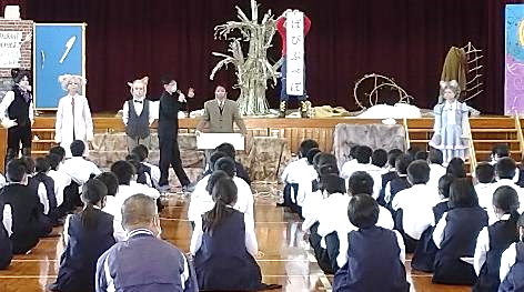 11月2日(火)は、午後から鑑賞教室がありました。原作は宮沢賢治の「注文の多い料理店」で、Aoi&Co.の方々による演劇でした。感染防止のため体育館の窓やカーテンを開け、明るい中での鑑賞でしたが、テンポの良い演技に生徒全員が引き込まれていきました。ミュージカルコメディ仕立てでみんな体全体で楽しめました。