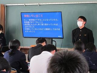 3月8日(木)は、3年生が1・2年生に自分の進路決定までの過程を発表しました。自分がどのように勉強してきたか、受験勉強を続けていくうえでの大切なこと、今現在の1・2年生がどのように学習に取り組むべきかなど、具体的で1・2年生が今日から早速取り組んでいこうという気持ちにさせてくれるものでした。