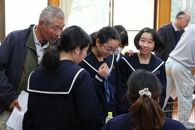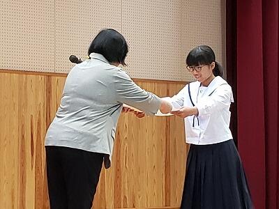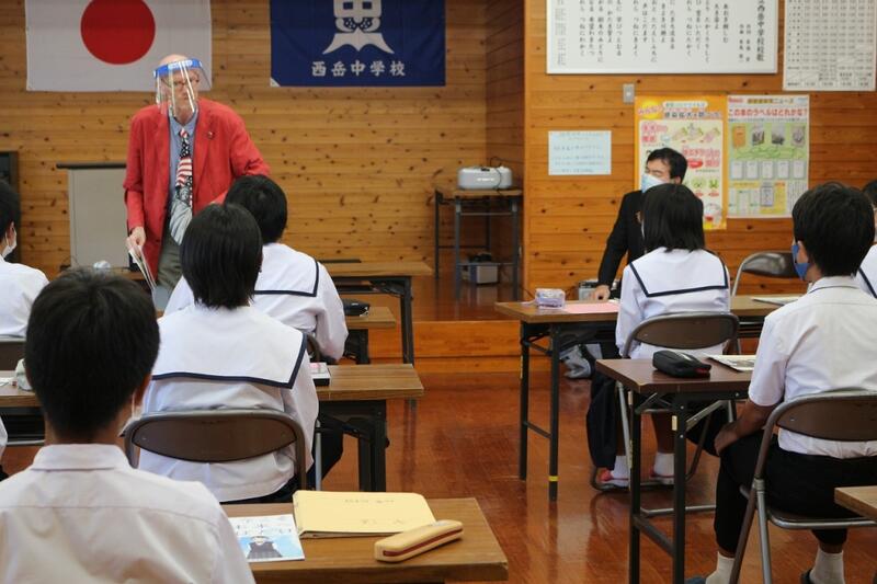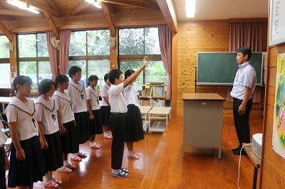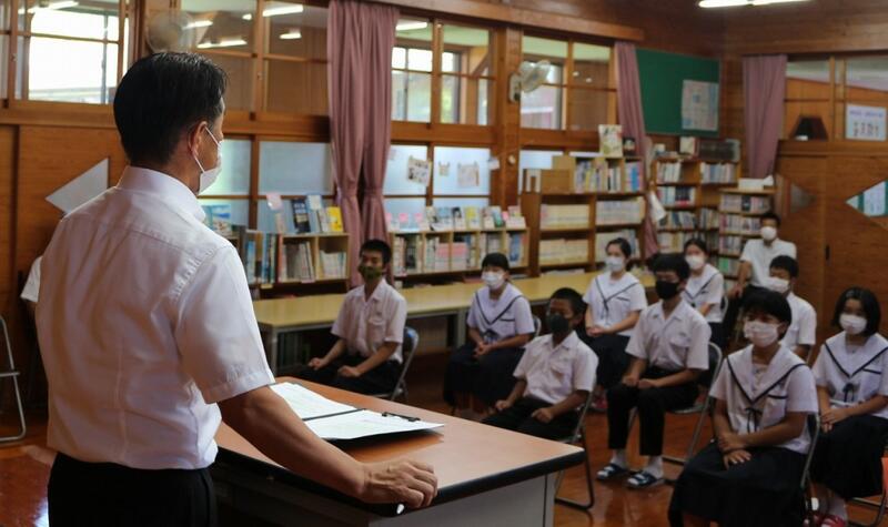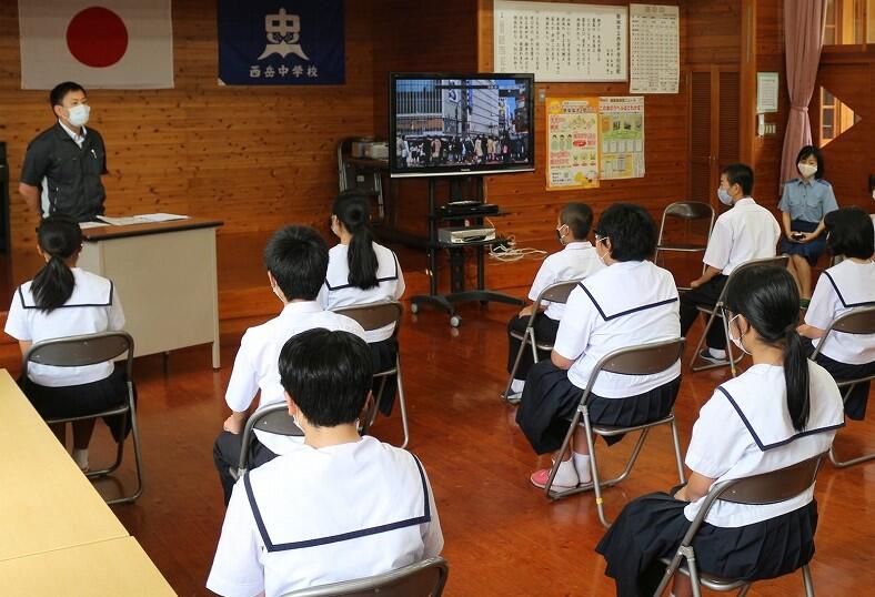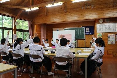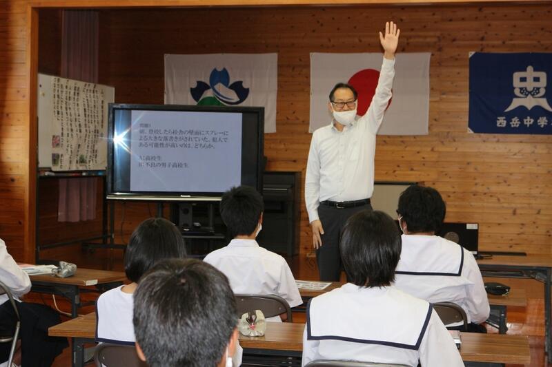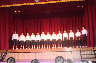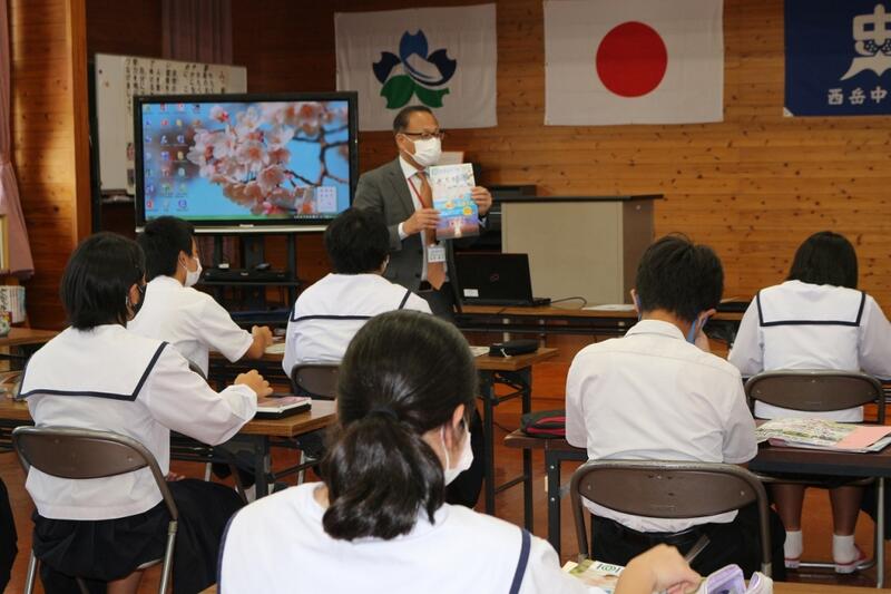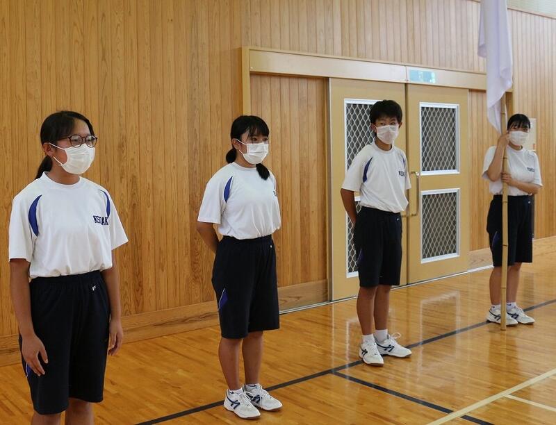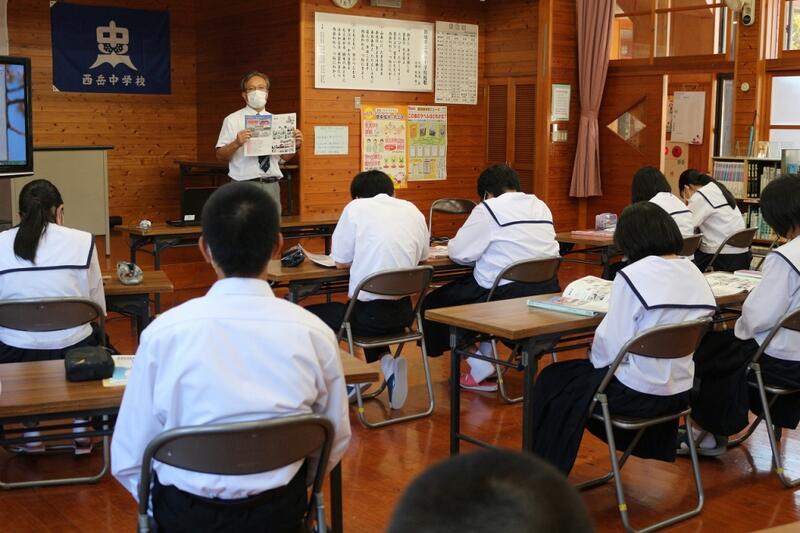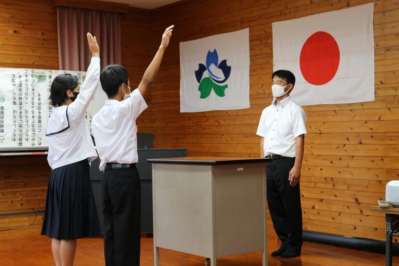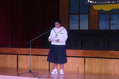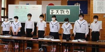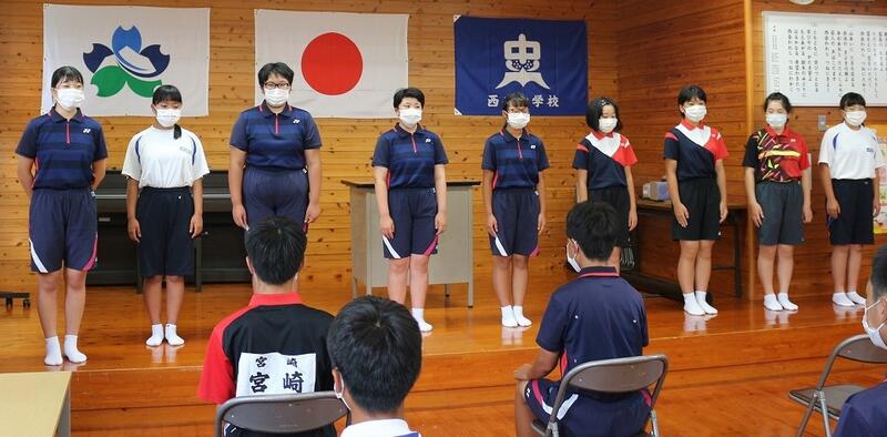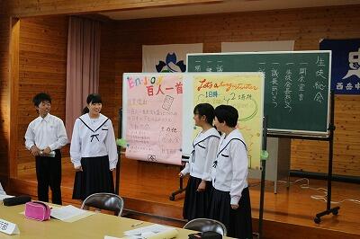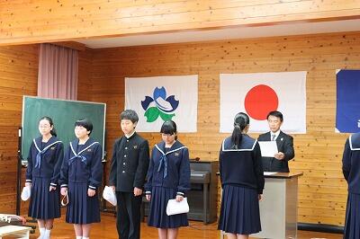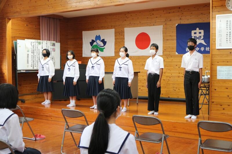 生徒代表が、西岳中のすばらしい自然や力を合わせて作り上げる行事などを紹介し、歓迎しました。