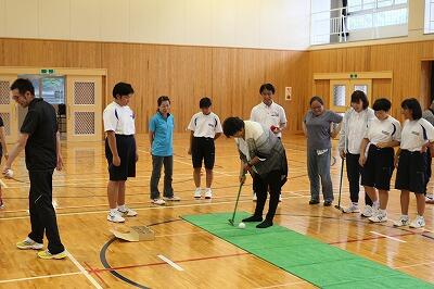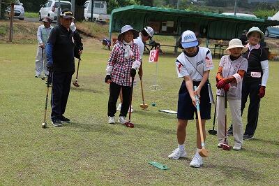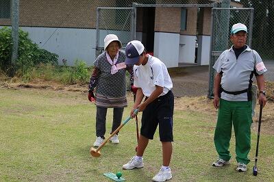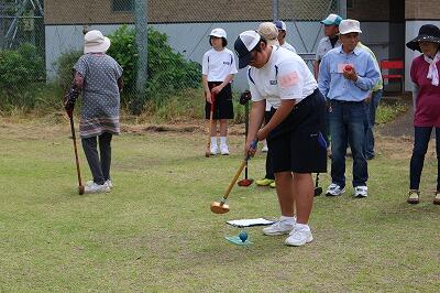 地域の高齢者の方と一緒にグランドゴルフを楽しむ