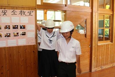 噴火発生の放送の後、ヘルメットをかぶり、多目的教室へ避難しました。