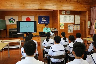 県都城警察署の方に講師として来ていただき、非行の重大さに対する理解や犯罪に巻き込まれないための行動等について話していただきました。代表生徒からは「身近なところにいろいろな危険があることが分かりました。携帯電話やSNSの使い方について気を付けていきたいです。」という感想が述べられました。