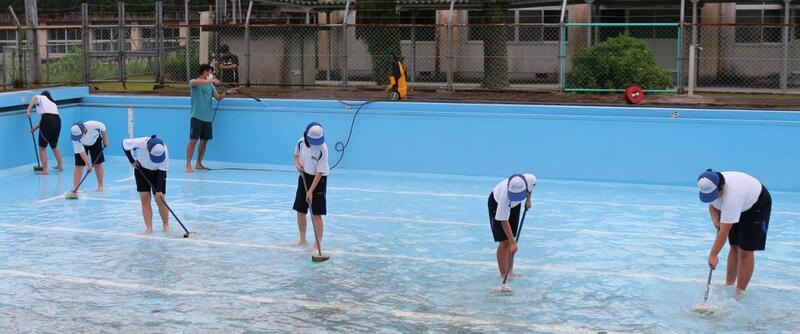 5月29日(金)快晴のもと、プール清掃を行いました。プール底にたまっていた1年間分の汚れがとてもきれいになりました。水泳の授業は感染拡大防止のため、2学期から実施予定です。