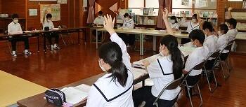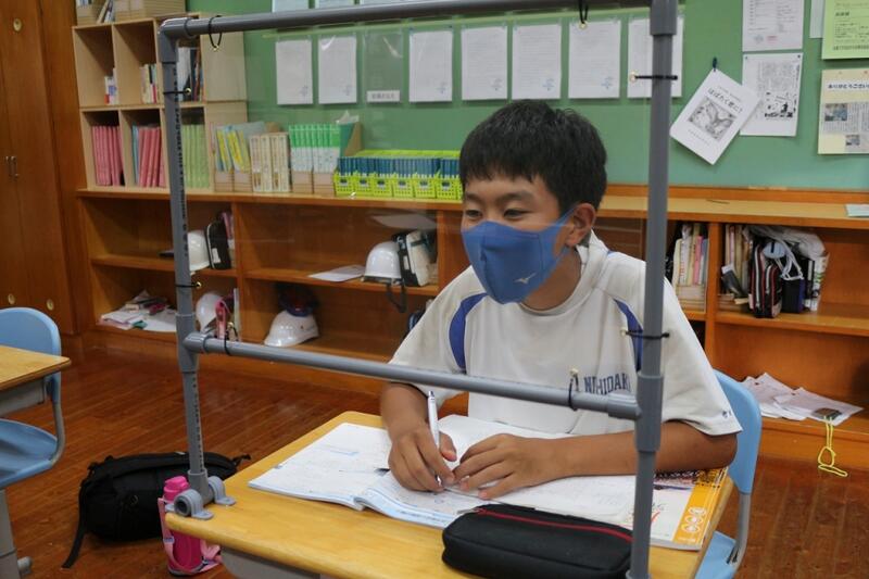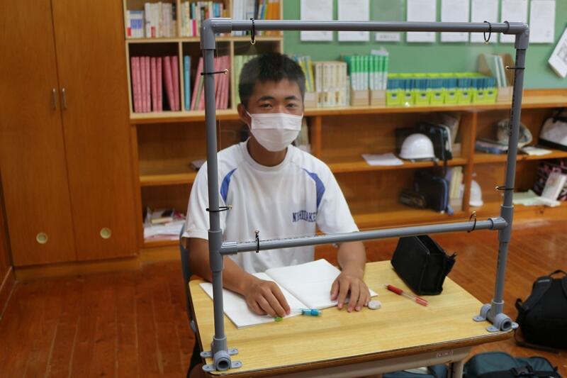 全校生徒の机に校長先生手作りの「新型コロナウイルス感染症対策パーテーション」が設置されました。透明のパーテーションが飛沫感染防止となり、ペアやグループ学習が可能となります。