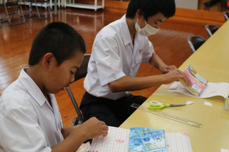 新しい本が届くと、図書係の生徒がブックコートの作業を始めます。