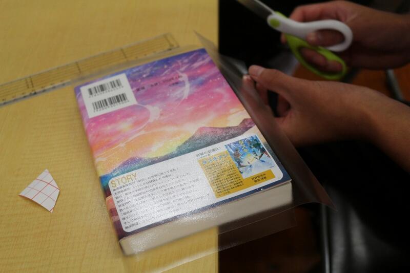 大事な本を傷や日焼けから守るため透明フィルムで一冊一冊丁寧にカバーしていきます。