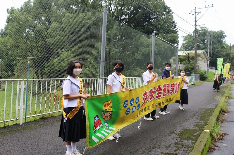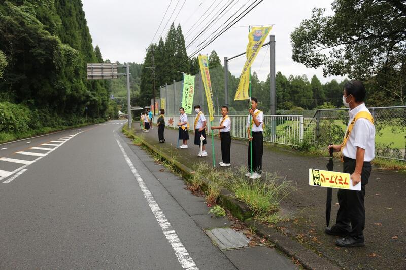 9月17日(木)朝のあいさつ運動に1、2年生が参加しました。校門前を通り過ぎるドライバーの方々に「おはようございます。」と大きな声であいさつし、たすきや横断幕等で交通安全を呼びかけました。