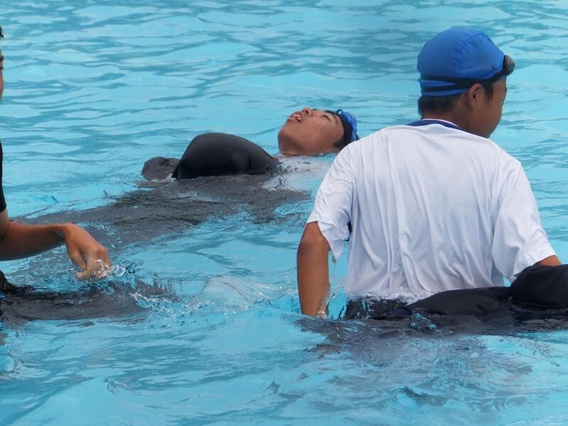 9月17日(木)4校時目に「着衣水泳」を行いました。服を着たまま水に入るような場面に遭遇した時のため、安全を確保するための泳ぎや浮き方、救助の在り方について学びました。