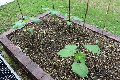 中庭には、緑のカーテン、オクラ、さつまいも、トマト、ナス、ピーマンなどいろいろなものが植えてあります。さつまいもは、何者かに荒らされて少し被害を受けました。犯人は、サル?、イノシシ?、あなぐま?、ムジナ?いろいろな説があります。