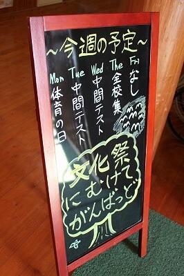 文化祭が終わりました。生徒たちには、気持を切り替えて勉強に集中するように話しました。家庭でもしっかりとした学習をして、学校で勉強したことを定着できるようにしてほしいと考えています。「集中と切り替え」大切ですね!