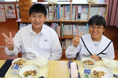 今日の給食のメニューは、「ご飯、秋野菜の煮物、牛肉と厚揚げのみそ炒め、ひじきのり」でした。食欲の秋、生徒たちはたくさん食べていました。