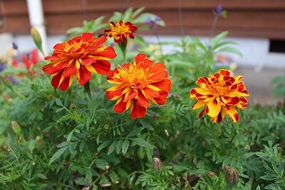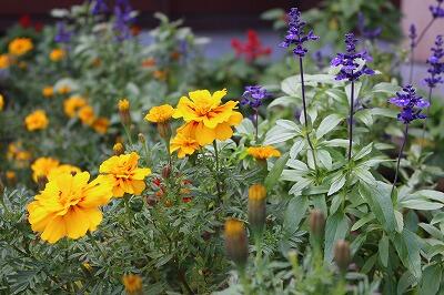 中庭の花壇には、サルビアとブルーサルビアとマリーゴールドが植えてあります。ここ数日で、マリーゴールドの花がつき始めました。雨に濡れて瑞々しい花がとてもきれいです。
