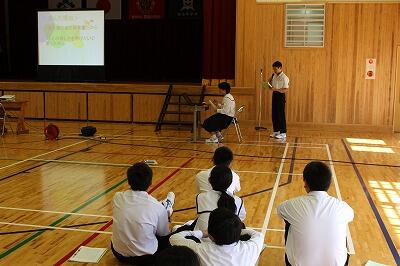 また、午後の最後は、明日から始まる都城地区中体連秋季大会の選手推戴式を行ないました。バドミントン部キャプテン、ソフトテニス部キャプテンが、それぞれに試合に臨む意気込みを述べた後、選手宣誓で頑張ってくることを誓いました。悔いのないように攻め続ける試合をして欲しいですね!