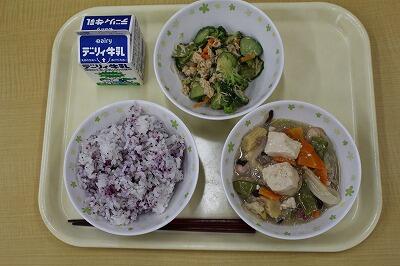 今日の給食は、「かみなり汁、根菜のそぼろ煮、ごはん、ふりかけ」でした。生徒総会に熱心に取り組んだ後で、大変美味しくいただきました。