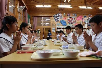 今日の給食は、「山菜うどん、牛肉とごぼうのしぐれ煮、ごはん」でした。ランチルームで全学年一緒に食べるので、全校生活委員長が前に出てメニューの紹介や食材の説明をして、ラジカセで音楽を流しながら仲良く食べています。和やかな雰囲気の給食時間です。