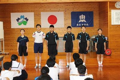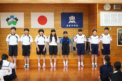 西岳中学校では「元気なあいさつ!」を励行しています。廊下にポスターを貼ったり、あいさつ競争をしたりして、がんばっています。目標は、地域の方々から「西岳中学校の生徒はあいさつがいいね!」と言われることです。学校で練習したあいさつを地域でも言えるようにがんばります。